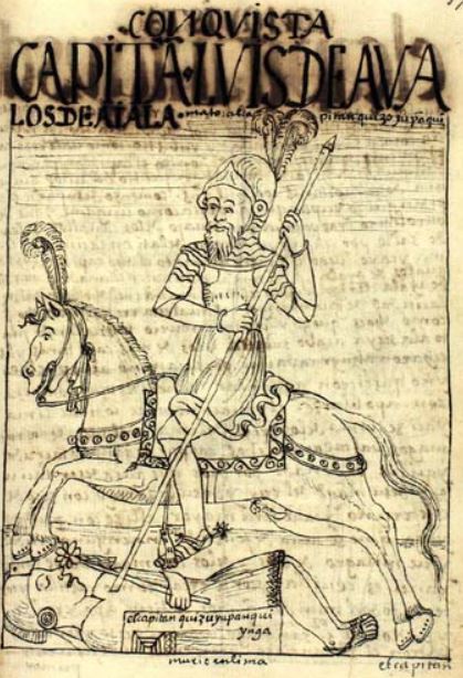 This chapter focuses on discussing the arrival of Spaniards and the Spanish conquest of Peru. This image depicts a captain named Luis de Avalos suited in armour as he rides on his horse in a battle against the indigenous peoples of Peru. Luis de Avalos is driving a spear into the chest of a captain named Quiso Yupanqui Inca. Whereas Luis de Avalos is suited in his armour, Quiso Yupanqui Inca can be differentiated by his traditional tunic and head gear. There is a caption written on Quiso Yupanqui Inca’s shield which reads, el capitan quizu yupanqui ynga, murio en lima [The Captain Quiso Yupanqui Inca, he died in Lima].
