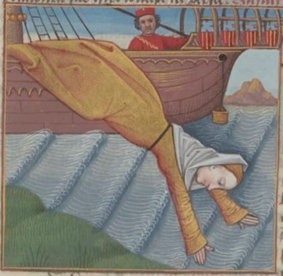Boccaccio explains that a Greek woman named Hippo had been captured by enemies, and when she heard them discussing a plan to defile her chastity, she decided that an early death was far better than having her honour destroyed. Hippo is illustrated plunging herself head first into the ocean. She drowned and successfully saved her honour. There is a man on the ship watching her jump to her death.