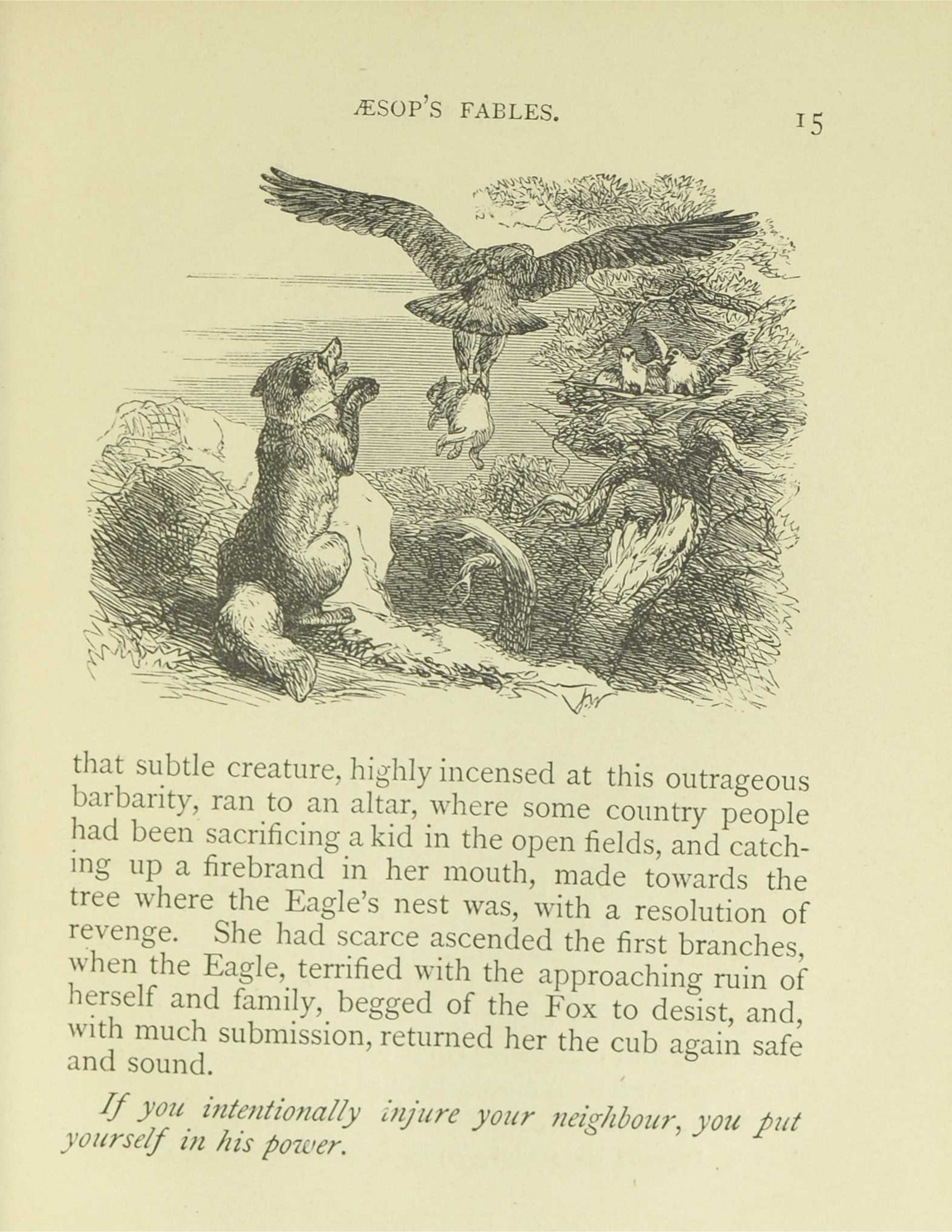 An Eagle that had young ones, looking out for something to feed them with, happened to spy a Fox's cub that lay basking itself abroad in the sun. She made a stoop and trussed it immediately; but before she had carried it quite off, the old Fox, coming home, implored her, with tears in her eyes, to spare her cub, and pity the distress of a poor fond mother who should think no affliction so great as that of losing her child.