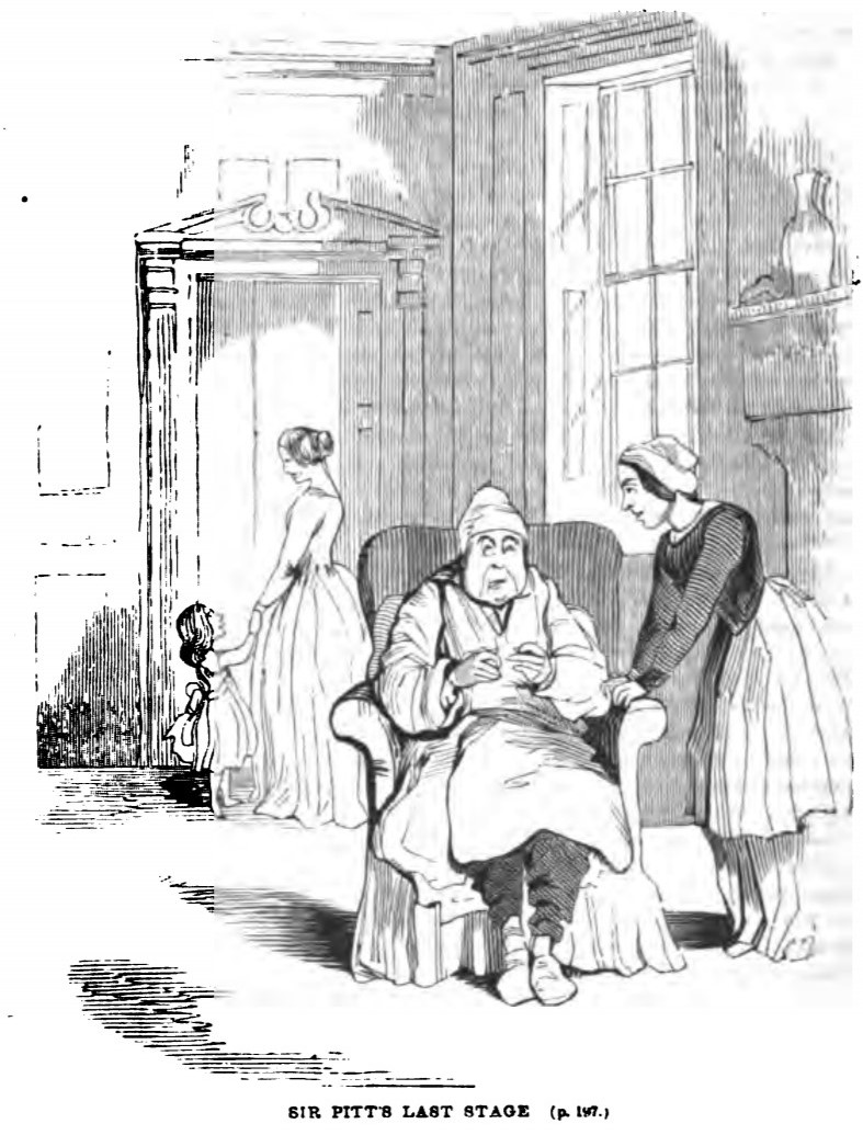 Sir Pitt Crawley, in a nightcap, sits in the chair in front of the fireplace in his apartments. Behind him, Lady Jane Crawley and her daughter, Matilda Crawley, are holding hands as they leave the room. Next to Sir Pitt, Miss Hester, now his nurse, has turned his chair away from the fire with a scowl on her face. Below the illustration is printed its title and location in the story, SIR PITT’S LAST STAGE (p. 197.).
