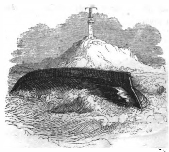Here we see an overturned boat that Gulliver discovered off the coast of Blefuscu. With the help of the Emperor’s largest vessel, Gulliver retrieved the boat and brought it back to land and spent several days fixing the bottom which was damaged. Gulliver then used this boat to leave Blefuscu and sailed off and was picked up by and English merchant’s ship. In the background is a lighthouse. Above the lighthouse is the letter T, because the first word of the chapter is Theils. The same image appears in the 1843 Krabbe edition.
