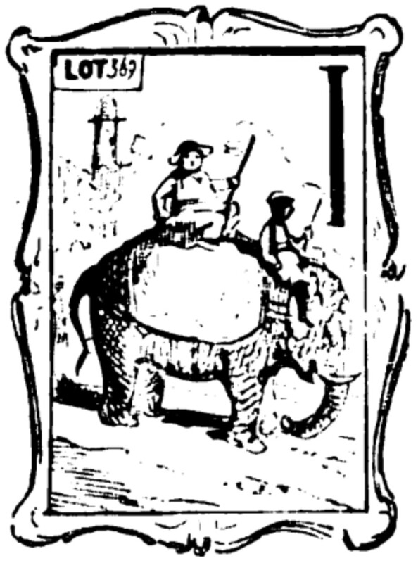 A framed portrait of Joseph Sedley holding a gun while riding on the back of an elephant, with a native driver sitting behind its head. In the top right of the painting is the letter I, from If. The picture is tagged in the top left corner with a paper labelled LOT369.
