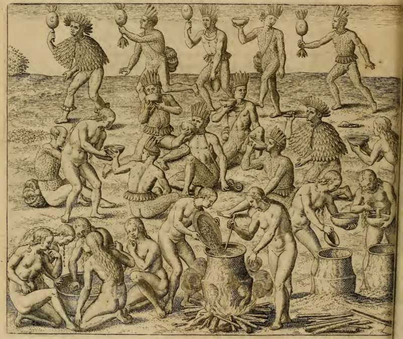 Tupinambá women prepare an alcoholic beverage using manioc (cassava) roots. On the left they chew the roots and spit them into a large pot. They then boil the chewed roots in a large pot over the fire, then strain the liquid into pots to cool (right). Behing the women, men drink from bowls and one plays a small wind instrument. More men dance in the background, holding round objects with half-moon symbols on them, perhaps ratels or religious items. Most of the men wear feathered headdresses and adornments around their waists, and some also wear feathered capes and necklaces.