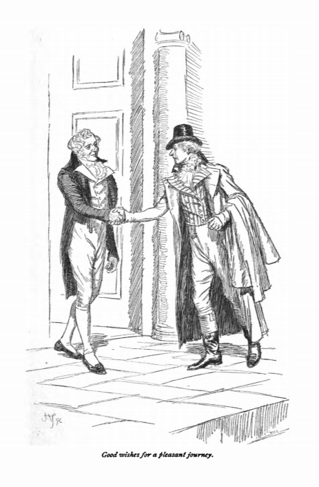 Here we see Edmund shakes Mr. Crawford’s hand, as he leaves Mansfield to go to London. Mr. Crawford had been flirting with both Maria and Julia Bertram, despite Maria’s engagement to Mr. Rushworth. Julia was glad to see him leave, because it had become clear that he preferred Maria, even though she was unavailable. This scene occurs in chapter 20. The characters are shown in the traditional regency style. Edmund and Mr. Crawford wear waistcoats and tailcoats, with breeches and cravats. Mr. Crawford also wears an overcoat and a top hat. The regency period dated to the early nineteenth century (1811-1820) when George, Prince of Wales, later George IV (r. 1820-1830), reigned as regent for his mentally ill father, King George III (r. 1760-1820). The regency period is associated with the rise of neoclassicism in art and fashion.