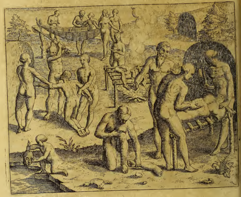 This image tells the story of a man’s death, dismemberment, and eventual cannibalization by the Tupinambá group. In the background of the image, the man lays in a hammock and is awoken by several Tupinambá people. On the left, the man kneels on the ground with two Tupinambá men at his sides holding each of his arms, while a third man standing in front of him holds a club above his head poised to fall. In the foreground, the man’s body is dismembered. Each of his limbs and his head have been removed, one arm lays on the ground and a child washes the head in a nearby pool of water. A bearded European man stands beside the men doing the dismembering and gestures towards them, perhaps in protest. In the center of the image, the man’s limbs lay on a wooden rack over a fire to grill while a woman watches.