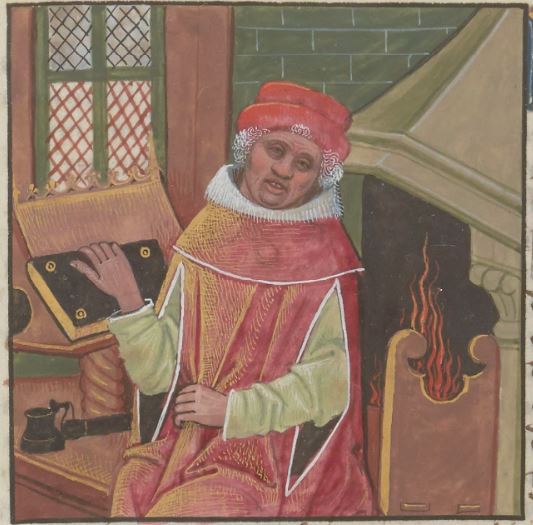 This image depicts what appears to be the author of the book, Giovanni Boccaccio. He is sitting in a study with a burning fire in the background and he is holding a book in his right hand which is presumably the book in which this image appears. He has white hair as he composed De Claris Mulieribus in his older age.