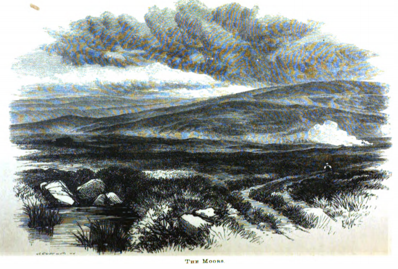 - Here we see the Moors of Northern England. Wuthering Heights takes place in the stormy Moors of Northern England, depicted here. A small figure walks along the Moors, a common pastime in the novel. Dark clouds loom above the Moors as it was almost always storming in the novel.