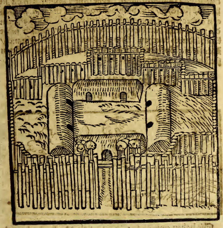 A Tupinambá Indigenous village is shown from above. The village consists of four long buildings end-to-end, arranged in a square. There are two fences surrounding the village, a tall outer fence that circles the village, and a lower inner fence arranged in a pattern around the four buildings. At the entrance to the village there are several skulls mounted on long poles beside the fence.