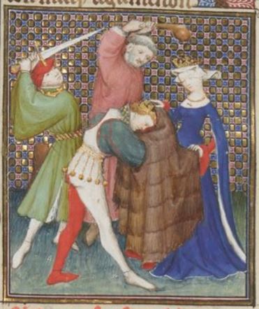 Queen Clytemnestra of Mycenae is depicted on the right side of the illumination wearing a crown and a blue dress. The man she has been having an affair with, Aegisthus, is depicted holding a sword beside her. Aegisthus and Clytemnestra conjured a plan to kill Clytemnestra’s husband, King Agamemnon, in order to gain control of Mycenae. Clytemnestra gave Agamemnon a piece of clothing that had no neck hole. He is depicted putting his head into the garment. As he struggled with the clothing, the adulterer Aegisthus pierced Agamemnon with a sword. Orestes, the son of Agamemnon and Clytemnestra, sought to avenge his father’s death. He is depicted on the left side of the image swinging a sword towards Aegisthus.