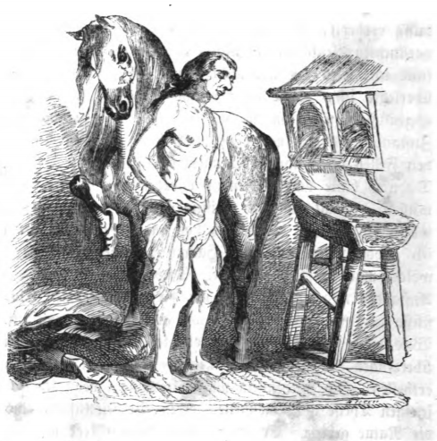 Astonished by the concept of clothing, Gulliver’s master examines both his clothes and his body. His Master noted that Gulliver’s body was different from that of the yahoos, in colour, softness and smoothness of the skin, and lack of hair, saying he must be a perfect yahoo. This reflects the European prejudice against Native Americans. Gulliver explained to his master why Europeans wear clothing, both for decency and for protection against the elements. His master questioned why someone would want to hide what nature had given them, as the Houyhnhnms were not ashamed of their bodies. Nevertheless, his master told Gulliver to do as he wished. The same image appears in the 1843 Krabbe edition.