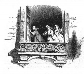 During Gulliver’s stay on Lilliput, a fire broke out in the Imperial Palace, in the Empresses' apartment. Gulliver put the fire out by urinating on it. Here we see the Empress and two of her maids looking out of a large palace window after the fire. The Empress is in the centre and can be distinguished from her maid and lady-in-waiting by her headpiece and clothing. The maid is on the left and the lady-in-waiting is on the right. Although the fire was in the Empress’s apartments, she chose not to return to those apartments after they had been refurbished given the manner in which Gulliver extinguished the fire. The same image appears in both the 1839 and 1843 Krabbe editions.