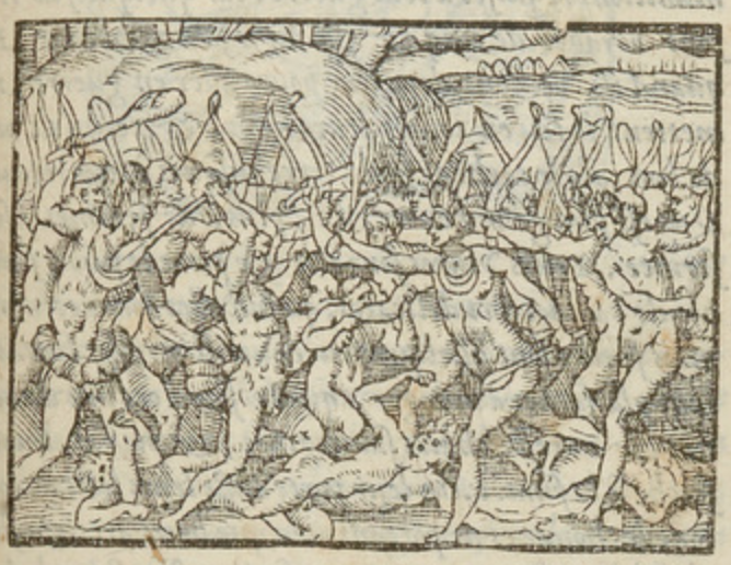 Two groups of Indigenous Brazilians engage in armed conflict. Members of both groups wield bows and arrows and clubs, and some bite members of the opposing group. Most of the men in both groups wear feathered headdresses and adornments around their waists, and some wear necklaces. Several men have fallen to the ground. This illustration is a simplified and mirrored version of the one found on page 71 verso of Paris, 1557.