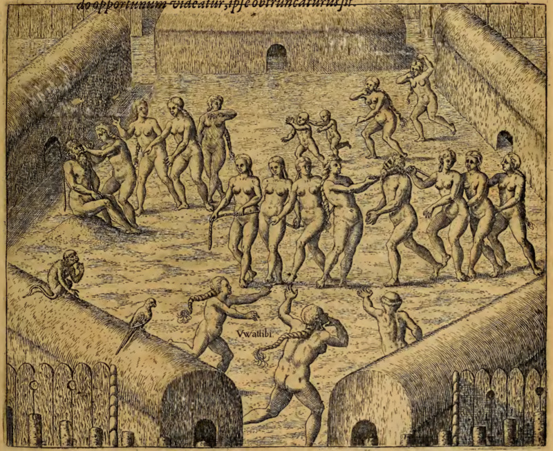 A European man is held captive inside a Tupinambá village, which is comprised of five long structures arranged in a pentagon and surrounded by a fence. The village is labelled ‘Uwattibi’. The man is shown having his hair cut by a Tupinambá woman in the left, and then on the right he is shown standing in a group of women with a rope tied around his neck. Several Tupinambá women hold both ends of the rope and dance around the man. There are two children present as well, and a monkey and parrot sit on top of one of the buildings on the left.