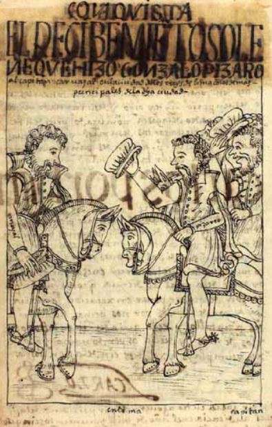 This chapter focuses on discussing the arrival of Spaniards and the Spanish conquest of Peru. This image depicts Gonzalo Pizarro on the right side of the image riding on his horse as he lifts his hat to greet Captain Francisco Carvajal. There are soldiers riding behind Pizarro accompanying him to greet Carvajal. Captain Francisco Carvajal is illustrated on the left side of the image on horseback, lowering his head as he accepts his greeting. Captain Carvajal is being greeted by Pizarro and his soldiers as he came to their aid to rebel against the crown of Spain. Captain Carvajal is identified by having his name written on his right sleeve, and Pizarro is identified by having his name written on his left sleeve. The caption at the bottom of the image reads en Lima [in Lima].