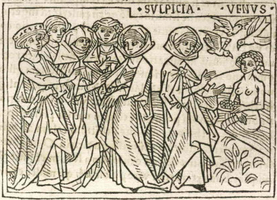 This engraving depicts Sulpicia, a woman renown for her chastity, consecrating a statue of Venus. Sulpicia is depicted on the right-hand side of the engraving with her hands reaching out towards the nude statue of Venus. We know that these figures are Sulpicia and Venus as their names are engraved above their heads. There are doves illustrated flying above the statue of Venus as dove’s are known to be one of many symbols of the goddess. There is a group of women depicted behind Sulpicia as they were all chosen as some of the most chaste women of their time, and they all voted for Sulpicia to be the one to consecrate the statue.