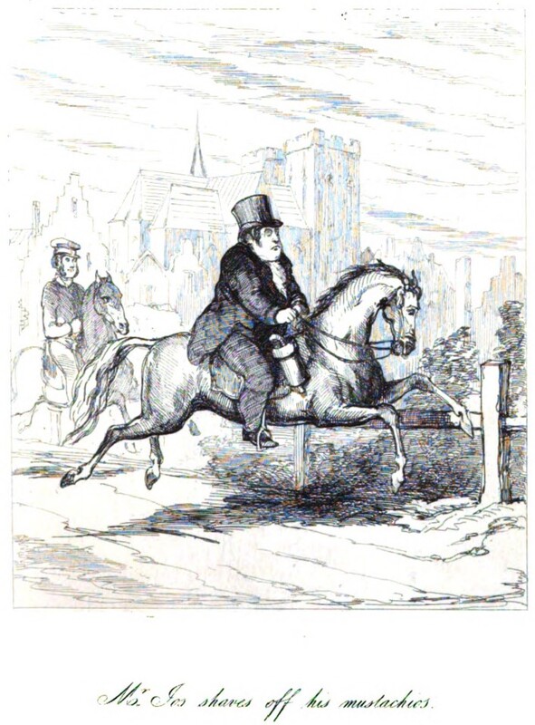 Joseph Sedley, freshly shaven, upon one of a pair of horses he has just purchased from Rebecca Crawley for an unreasonably large sum in order to flee from Brussels. Behind him is Isidor, his valet, on the other horse from the pair. Amelia has refused to go with the two, as her husband is still on the battlefield. Below the illustration is printed in cursive its title, Mr. Jos shaves off his mustachios.