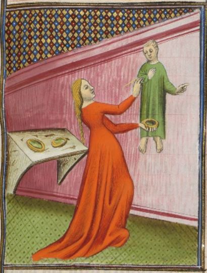 This illumination depicts a woman named Irene painting a figure of a child on the wall in front of her. There is a table beside her with her painting tools laying on top. Irene was a renowned, skillful painter during her time which Boccaccio believed to deserve praise as the arts were not a common practice of women. Boccaccio explains that Irene was the daughter of a man named Cratinus, who was also a painter (although much less renown).