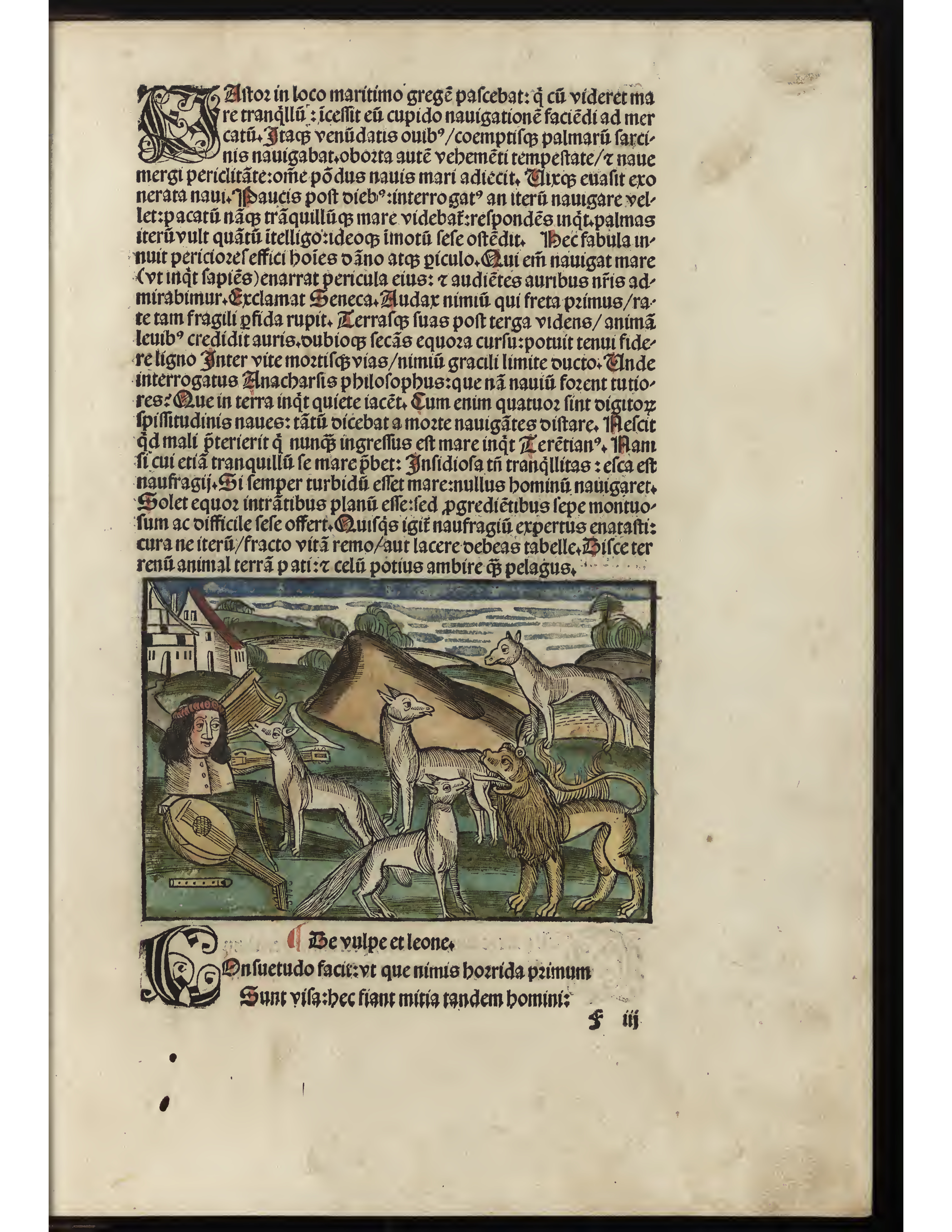 - A fox and Lion stand face to face while an array of animals surround them, an assortment of instruments surround the upper half of a man.