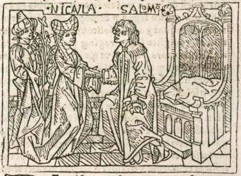 This engraving depicts Nicaula, the queen of Ethiopia, on the left-hand side of the engraving shaking hands with king Solomon of Jerusalem. We know that these figures are Nicaula and Solomon as their names are engraved above their heads to identify them. Nicaula, as Boccaccio explains, was incredibly wise and wanted to hear and listen to the wisdom and intellect of Solomon. She had traveled from Ethiopia to Jerusalem to meet him. This engraving depicts their first meeting. Behind Nicaula is presumably one of her servants, who is carrying a tree. The tree was one of many gifts that Nicaula had given to Solomon.