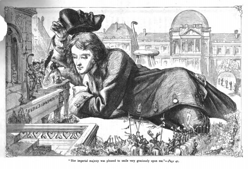 Here we see Gulliver looking in the window of the Imperial Palace of Lilliput in the city of Mildendo. Gulliver lies on his side and looks in. He raises his hat in greeting of the Empress, who stands on the balcony and greets him. A crowd of guards surrounds Gulliver in the courtyard of the palace.