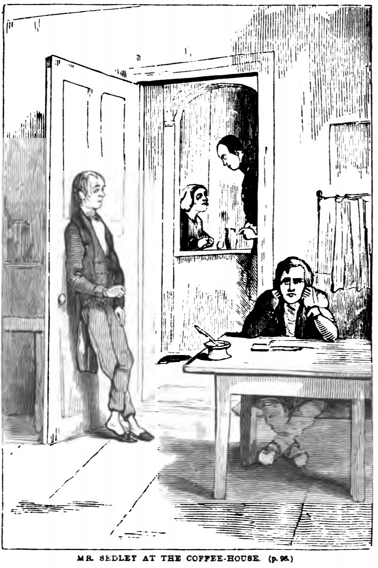 John Sedley is seated at a table at the Tapioca Coffee-house, slouching over with his elbows resting on the table and his scowling face between his fists. On the table in front of him are a few pieces of paper and an inkwell with a quill. The door to the room is held open by a bored-looking man who leans against it. Through the doorway, William Dobbin can be seen talking to the woman at the desk. Below the illustration is printed its title and location in the story, MR. SEDLEY AT THE COFFEE-HOUSE. (p. 96.).