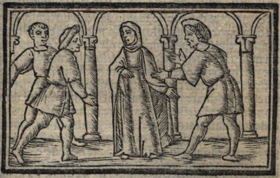 In the centre of the illustration, we see a female figure wearing a robe and a veil. There are two male figures to the left and one to the right. Because there are two female characters (Elicia and Areusa) and one male character (Centurio) in Act XV, we can say that this illustration does not relate to the events contained within the act.[This illustration is identical to those found in Acts IV (folio 32r), V (folio 42r), VI (folio 45r), VIII (folio 62r), X (folio 74r), XIII (folio 93v), and XVII (folio 109r).]