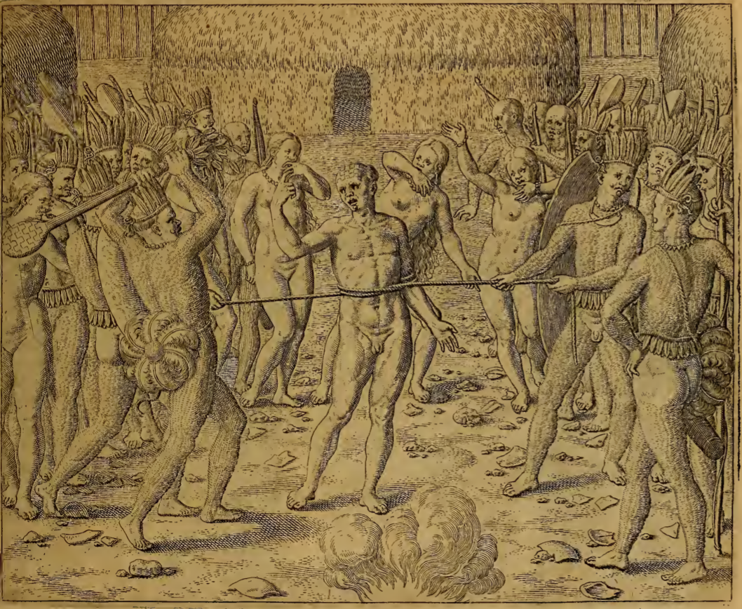A group of Tupinambá people are ceremonially executing a male captive. The man is restrained by a rope tied around his waist, with each end of the rope held by one of the Tupinambá. A Tupinambá man in front of the captive holds a decorative club above his head, poised to swing. Most of the men in the group wear necklaces and feathered headdresses and adornments tied around their waists, and some hold bows and shields. The women also wear necklaces. A fire burns in front of the captive man.