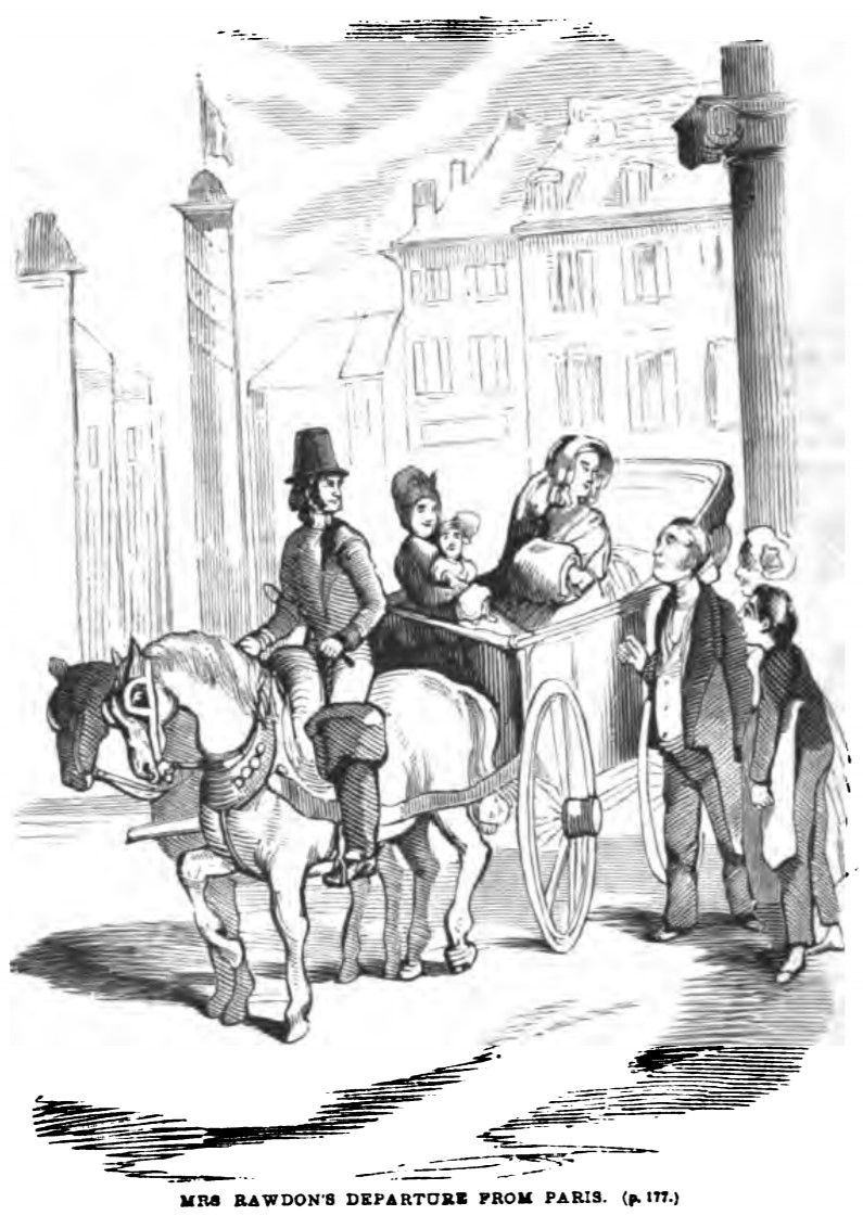 Rebecca Crawley sits grandly in a carriage, wearing a bonnet and muff and saying her farewells to a group of people standing beside the carriage. Opposite her sits Genevieve, the maid, holding little Rawdon. The carriage is pulled by a pair of horses, with the driver seated astride the larger of the two. In the background, the buildings of Paris and a tall tower topped with a flag can be seen. Below the illustration is printed its title and location in the story, MRS RAWDON’S DEPARTURE FROM PARIS. (p. 177.)