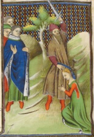 This illustration depicts Verginius, a plebeian man, swinging his sword in the air as he about to kill his daughter Verginia, who is sitting in front of him. To protect his daughter’s chastity, Verginius stabbed Verginia as death would be better than her honour being destroyed. The men illustrated behind Verginius are most likely Appius Claudius and Lucius Icilius, as they were present in Boccaccio’s telling of the story.
