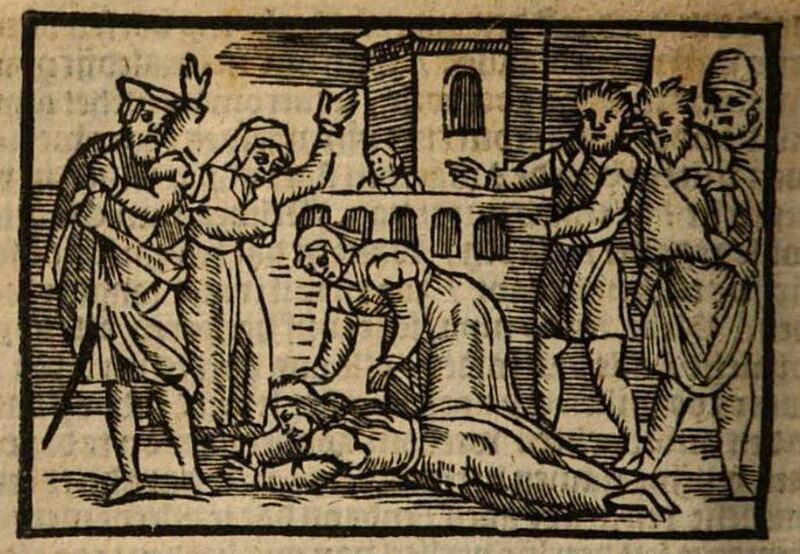 In this illustration we see Melibea lying dead on the ground after jumping from the tower of her house (the tower can be seen in the background, though the perspectival distance is off). The leftmost figure is Pleberio, who is wearing a hat and a cloak of sorts, with a sword mounted on his belt. One of the two women beside Melibea is Lucrecia, and we can assume that the other is meant to represent Alisa (even though she is not present when Melibea jumps). Both women are wearing a robe and a veil. The other male figures appear to be random onlookers who witnessed her fall.This illustration is odd, seeing as there is no scene that occurs outside after Melibea jumps. Instead, the entire 21st act consists of Pleberio going to his wife Alisa in their bedchamber and informing her of their daughter’s death.
