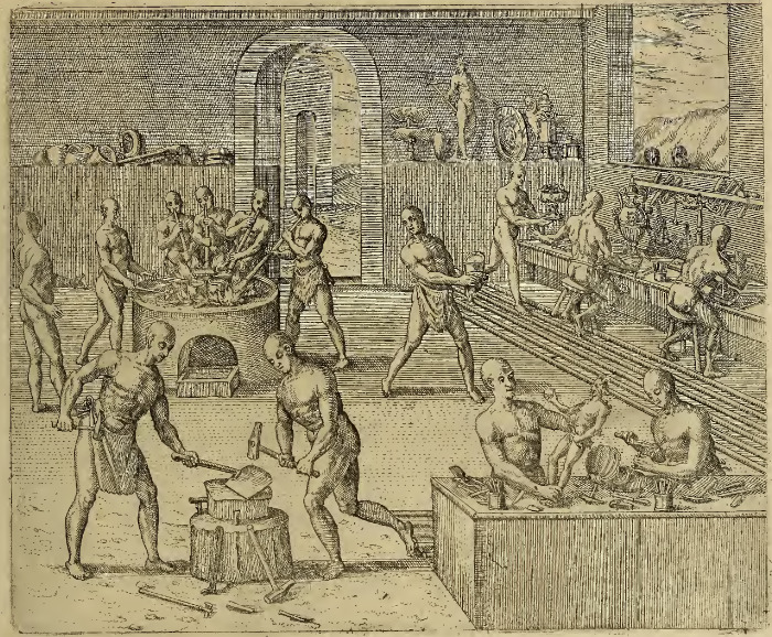 A group of Inca men work with gold in a space that is both forge and workshop. In the middle of the room is a large round kiln or furnace with a fire burning on top, in which several pots have been placed. A group of men stand around the kiln, blowing on the fire through hollow reeds. In the foreground two men hammer a sheet of gold, and beside them at a table two men use fine engraving and carving tools to ad detail to gold statuettes and ornaments. On the left there is a second, similar worktable. On a recessed shelf along the far wall of the building are several finished pieces, including a large plate, several vessels and a small statue. This image is identical to one found on page 27 (163) of Frankfurt, 1596.