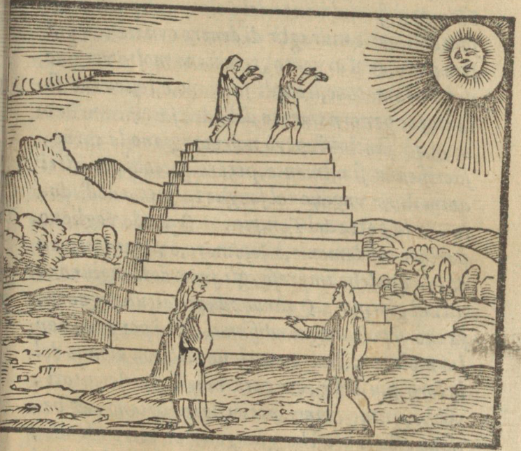 Two Indigenous people in Peru stand atop a step pyramid to worship the sun. They face the sun, with their hands raised towards it. The sun has been designed here with a face that gazes down towards the worshippers. At the base of the pyramid, two other Indigenous people stand in conversation. This image is identical to one found on page 166 verso of Venice, 1565.