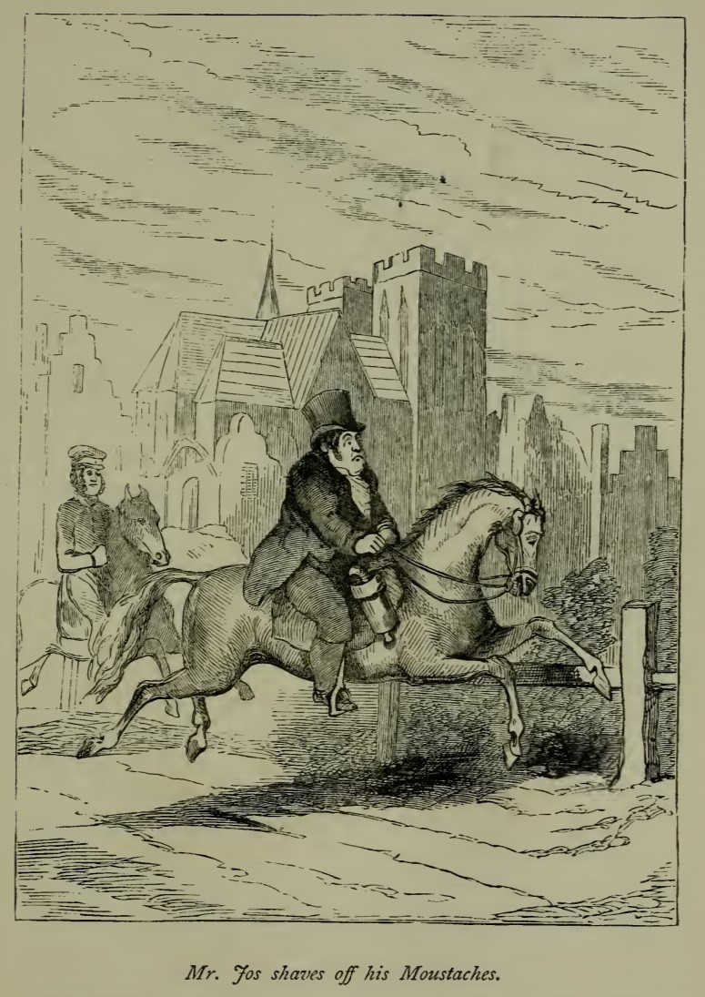 Joseph Sedley, freshly shaven, upon one of a pair of horses he has just purchased from Rebecca Crawley for an unreasonably large sum in order to flee from Brussels. Behind him is Isidor, his valet, on the other horse from the pair. Below the illustration is printed in cursive its title, Mr. Jos shaves off his Moustaches.