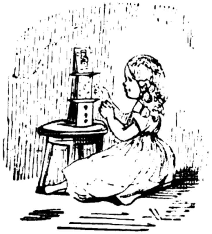 A small girl in a long dress, likely Rosalind or Violet Crawley, is seated on the floor. In front of her on a stool is a small card tower, three high, towards which she is reaching.