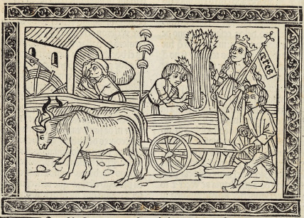 Ceres is depicted on the right-hand side of the engraving wearing a crown and holding a scepter. We know this is Ceres as her name is written beside her scepter. We also know this is Ceres as she is the goddess of harvest, which is what this engraving depicts. Boccaccio explains that after discovering agriculture, Ceres had tamed oxen and trained them to yoke. She also discovered planting seeds and then taught men how to harvest them once they matured. There is one man plowing the fields with the oxen, and another in the background husking grain. There is another man with a bag of flour over his head, as Ceres also taught men how to turn flour into an edible fare. Ceres wears the crown and scepter to signify her importance linked to agriculture and harvest.