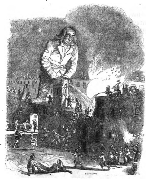 [Gulliver extinguishes a fire in the Imperial Palace on Lilliput]