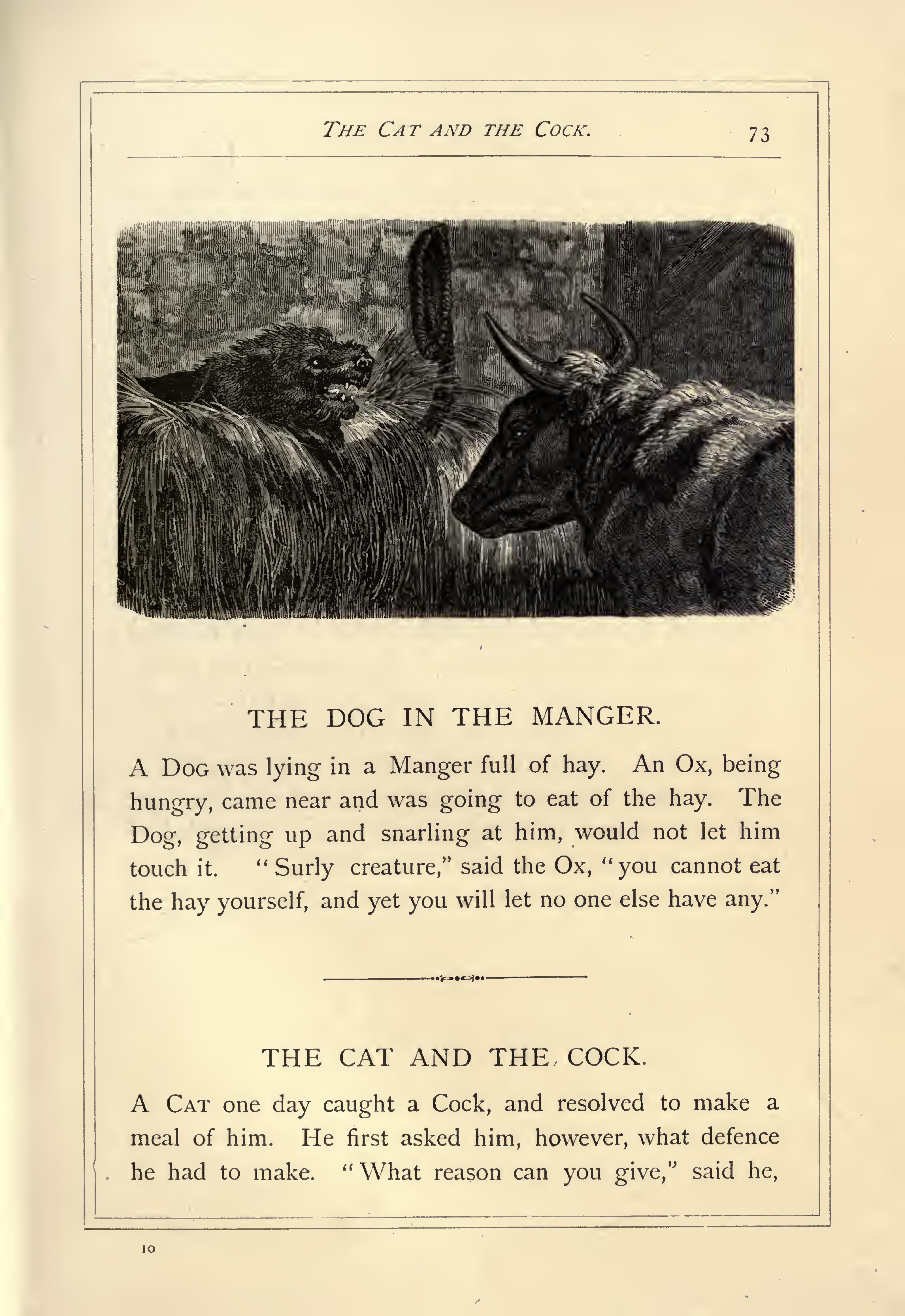 On the left side of the image, a dog is in an Ox’s manger hidden in the hay. He has both his front paws on the border of the manger as he sticks his head out. His mouth is slightly open, and his nose is wrinkled back as though he is snarling. In front of the dog, to the right of the image, the upper body of an ox is visible. The ox is looking directly at the dog with anger in his white-glowing eyes as he cannot eat since the dog is in there. Behind them, the walls are made of brick-like materials.