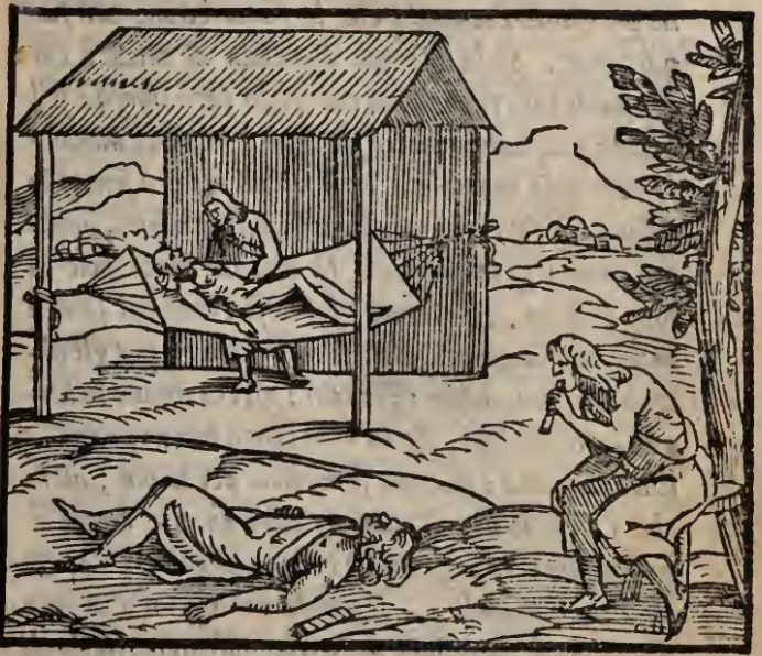 An Indigenous man seated on a three-legged stool smokes a pipe, while a second man lays on his back on the ground nearby with a pipe on the ground near his arm. In the background, a man tends to another person lying on a hammock under a shelter with a roof and one wall.