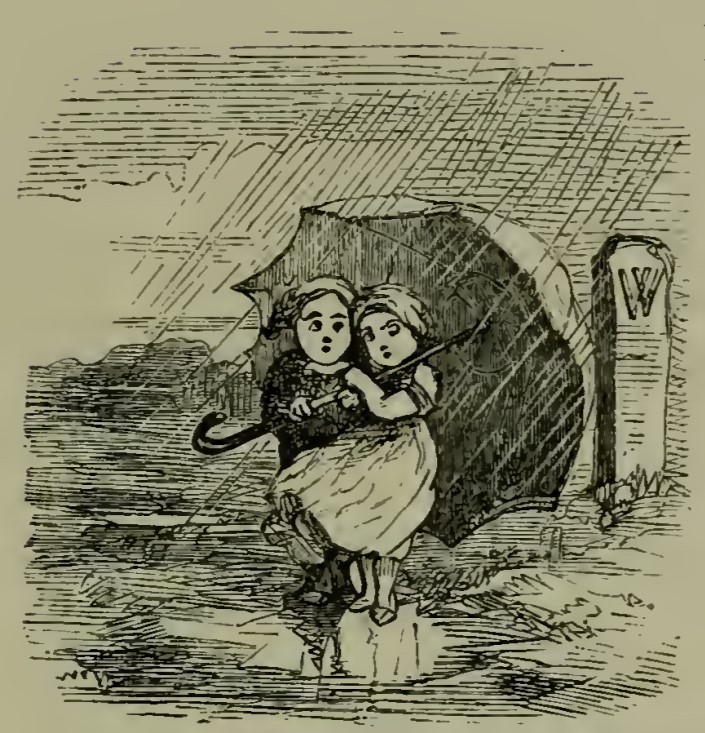 Two children, a boy and a girl, stand huddled under a large umbrella, their backs turned to the rain which is coming at them from the right at a steep angle. Behind them, to the right of the image, the letter W from We is beneath an arch.