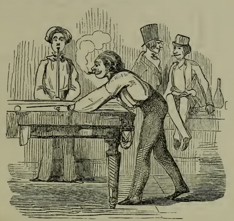 Rawdon Crawley, smoking a cigar, leans over the billiards table as he lines his cue up with a ball. On the other side of the table is a man holding his cue vertically. In the background to the right are two other men, one standing and wearing a suit, and the other seated on the edge of a table while smoking.