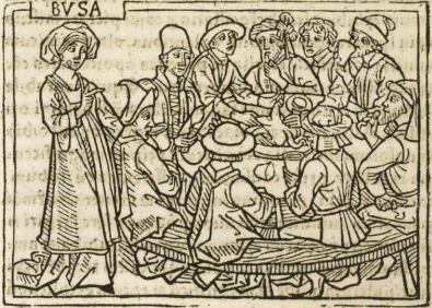 This engraving depicts a woman named Busa on the left-side of the image looking at the group of people in front of her. We know that this figure is Busa as the creator engraved her name above her head. Boccaccio explains that after a city called Cannae was attacked by Hannibal the Carthaginian, the people fled to Canusium. Busa opened her home graciously to the people who fled the danger of war and provided them with hospitality and food. These are the people who are depicted sitting around Busa’s table.