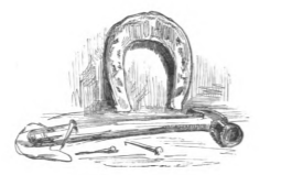 Here we see a horseshoe and the hammer and nails used to attach them. Gulliver explained to the Houyhnhnms how horses were treated in Europe and how horseshoes worked. Gulliver explained that horseshoes were used to protect horses' hooves while they were working.