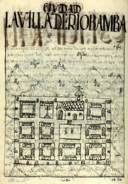This image is depicted in the author’s chapter where he discusses cities, towns, villages, and provinces in colonial South America. This image depicts the town of Riobamba, Ecuador. The town is laid out in a grid and has twelve blocks within that grid. There are eight blocks in the grid that have four houses within them. One of the blocks is a church, and to the left of the church, there is a block with a cross in it. The block in front of the church appears to be a main square with two people standing in it. The Andean mountainous landscape is visible in the background with birds flying above and goats roaming the mountains. The caption at the bottom of the image reads villa [town]. The author explains that this city was founded by Spanish conquistador, Francisco Pizarro.