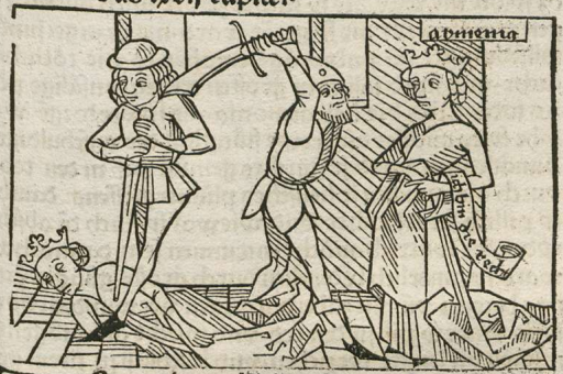 This engraving depicts a young servant girl getting stabbed in the chest with a sword by a man standing above her. This young servant girl is disguised to look exactly like Harmonia, the daughter of Gelon (brother to the king of Syracuse). Boccaccio explains that there was a rebellion in Syracuse against nobility, and before the murderers could get to Harmonia, her nurse disguised this young woman to look like Harmonia. The real Harmonia is depicted on the right side of the engraving. The creator engraved her name, written as Armonia, above her head to identify her. There is a man swinging a sword above his head which appears to be heading in Harmonia’s direction, however, Boccaccio explains that Harmonia hid from the murderers until they killed the look-alike servant.