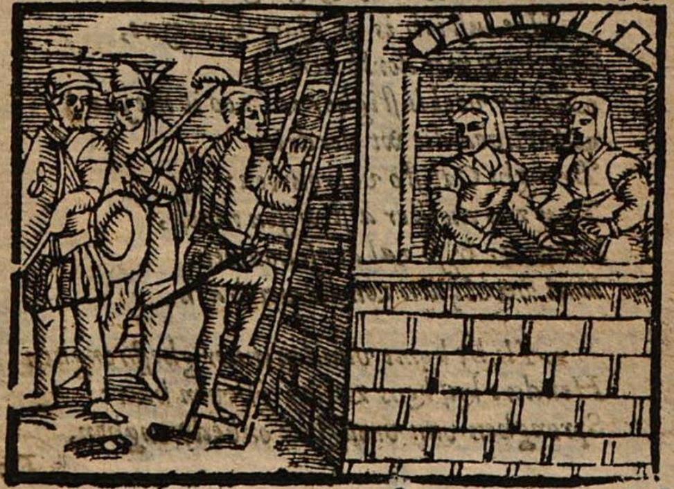 Calisto goes to visit Melibea as promised, accompanied by Sosia and Tristan instead of Sempronio and Pármeno. He ascends the high wall to Melibea’s garden while Sosia and Tristan stand guard (as seen in this image). Centurio’s men arrive and begin harassing Sosia, but Sosia manages to scare them off. To the left of the image we see Calisto, with a sword mounted on his belt, climbing a ladder to enter Melibea’s garden. Sosia and Tristan stand behind him with swords and shields. To the right we see Melibea and Lucrecia looking out from a window. Each is wearing a robe and a veil. They seem to be making eye contract with Calisto, though perspective makes this impossible. The entire image is identical to those found on pages 178 and 209 of the text.