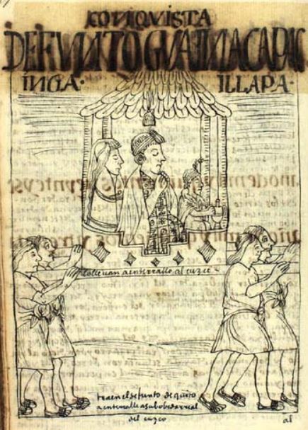 This image depicts the body of the Inca Emperor, Huayna Capac Inca, being carried to his burial in his royal litter. He is depicted sitting upright with his eyes closed dressed in traditional regalia. His coya [queen] is sitting behind him and a figure is sitting in front of him, presumably a priest of sorts to aid in burial rituals. There are four people carrying the litter on their shoulders with two in people the front and two in the back. The caption written on the litter, lo lleuan a enterrallo al Cuzco [they carry him to bury him in Cusco]. The caption at the bottom of the image reads, traen el defunto de Quito a enterralle a su bobeda rreal del Cuzco [they bring the deceased from Quito to bury him in the royal mausoleum in Cusco].
