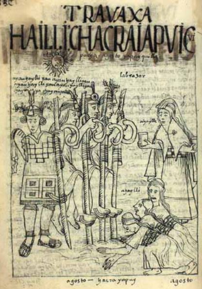 This image is reflected in the final chapter of Ayala’s chronicle where he provides a description of labours and festivals that occur in the rural areas of the Spanish colonial Andes during each month of the Inca calendar year. This image depicts the month of August which was a time of triumphal songs to celebrate the harvest, as well as a time for turning the soil in preparation for a new harvest season. The sun is illustrated shining in the top left corner of the image. There is a line of indigenous men dressed in traditional garb holding agricultural tools as they sing a song. The song lyrics are written above their heads: Ayau haylli yau, ayau haylli yau, ayau haylli yau, ayau haylli yau. chaymi coya, chaymi palla [Ayaw haylli, yaw, ayaw haylli, yaw, ayaw haylli, yaw, ayaw haylli, yaw, here is the queen, here is the lady]. There are three bowing women on the right side of the image and one woman who is standing with a cup in her right hand. The words Ahaylli [viva] are written beside the standing woman and the bowing women. The caption at the bottom of the image reads agosto, [c]hacra yapuy [august, ninth month].