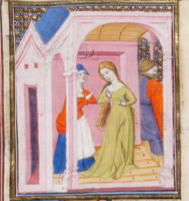 When her husband was proscribed, Curia hid him in the walls of their house so that he could not be found. She acted as though he was gone, and her fake mourning had everyone fooled into believing her lie. The image depicts Curia, wearing a green gown, mourning with her friends and family while her husband hides in the walls. He is seen hiding to the far right of the image, wearing purple and red.