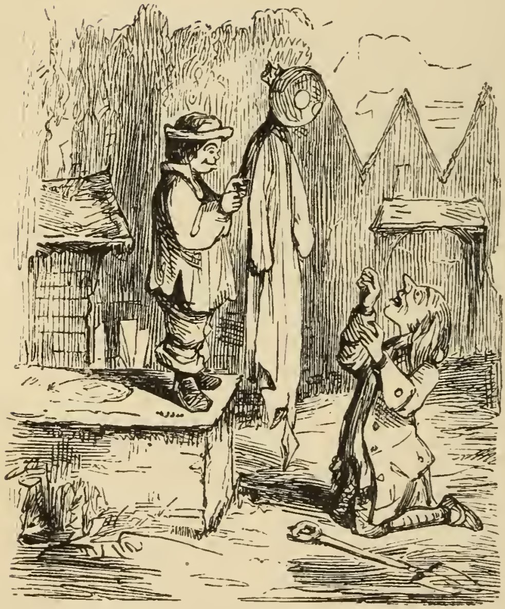 A satisfied looking boy standing on a rectangular box or platform holds in front of him a stick. On it are a turnip disguised as a head and a ragged sheet or coat, forming the semblance of a ghost. A terrified looking man is on his knees with his arms raised in front of the ghost, a shovel dropped beside him. A tall fence in the background forms the letter W from We.
