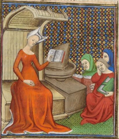 This illumination depicts the famous poetess, Sappho, sitting on the left side of the image looking at her book which is placed on the lectern in front of her. The book in front of her is assumed to be some of her own poetry. She is illustrated wearing an orange dress and a head piece. There are three people on the right side of the image who are most likely other poets. Boccaccio explains that Sappho was included among the most famous of poets.